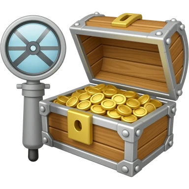 An icon featuring a treasure chest partially open, revealing gold coins and jewels. A metal detector and a shovel are nearby, symbolizing the excitement of treasure hunting. The design evokes adventure, exploration, and the thrill of discovering hidden treasures. transparent background. emoji