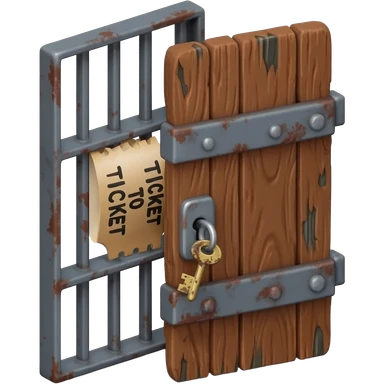 emoji of a miniature prison cell door. featuring wood and dark grey iron bars. The door is slightly ajar, revealing a rolled-up paper sticking out. Clearly legible text on the paper reads 'TICKET TO JAIL' , slightly messy letters. A small, rusty metal key hangs from a ring near the lock. emoji | AI Emoji Generator