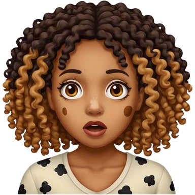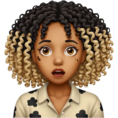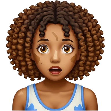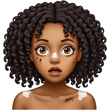 Emoji of a very shocked black female with vitiligo (alot of vitiligo patches) give her more curly hair emoji