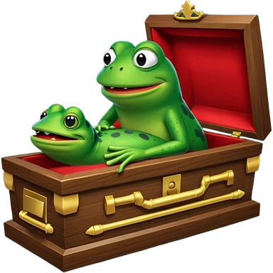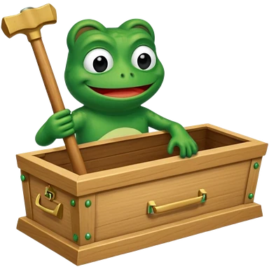Emoji of an empty wooden coffin labeled ‘ECHO,’ being nailed shut by a king-like Pepe the Frog wearing a crown and cape emoji | AI Emoji Generator