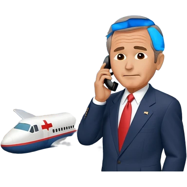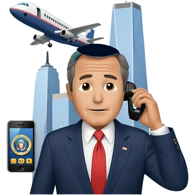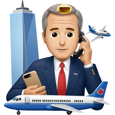 emoji of the world trade center with a plane crashed into it and george bush on a phone in front of them