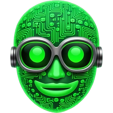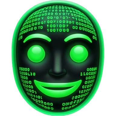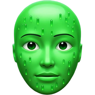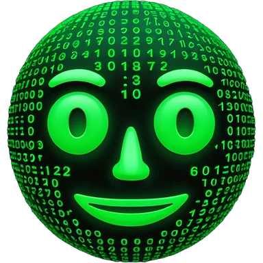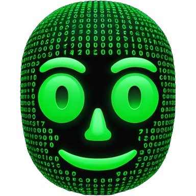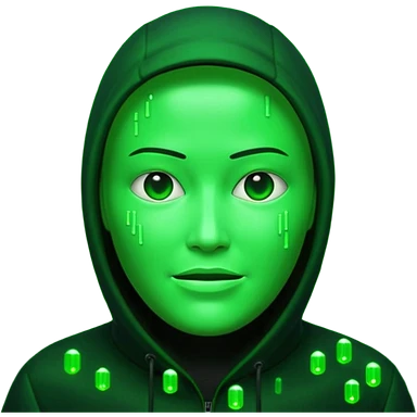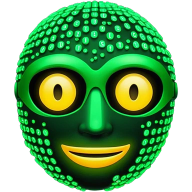 Emoji inspired by The Matrix film, glowing green terminal code forming a face, digital rain backdrop, hacker cyberpunk aesthetic, high contrast black and green, cinematic sci-fi lighting, ultra-sharp 3D. emoji