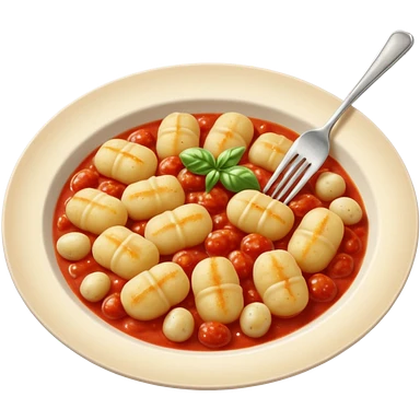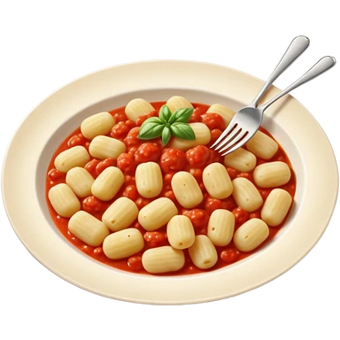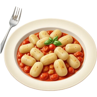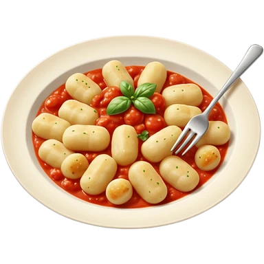 Gnocchi Cinematic Realistic Gnocchi Dish Emoji, depicted as tender oblong potato gnocchi garnished with iconic fork marks on top, rendered with soft textures and warm, inviting lighting. add tomato sauce emoji