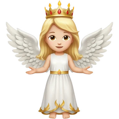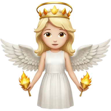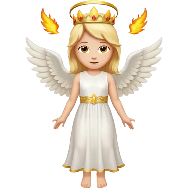 Emoji-style angel: blonde hair, golden flame crown, halo, large detailed wings, white dress, visible feminine body shape, cute smooth emoji look. emoji | AI Emoji Generator