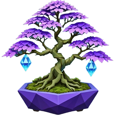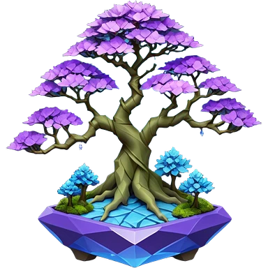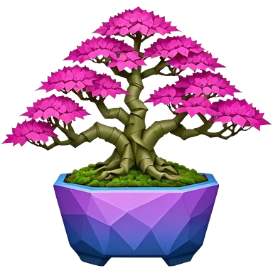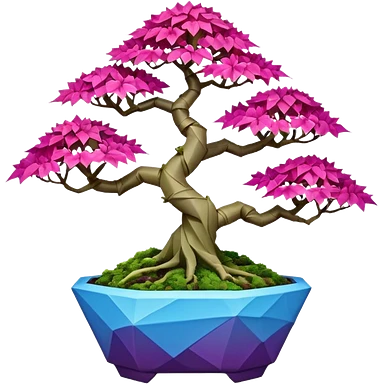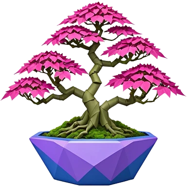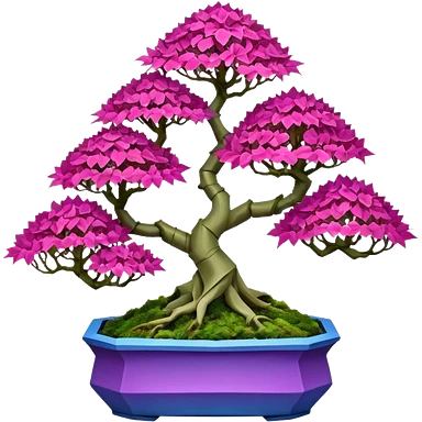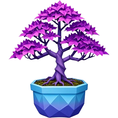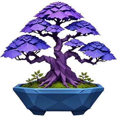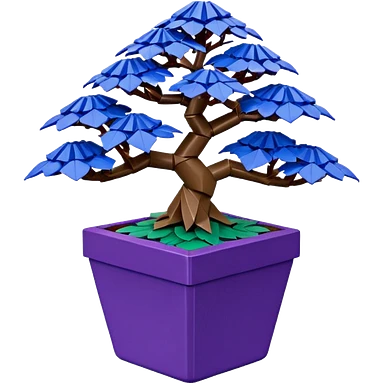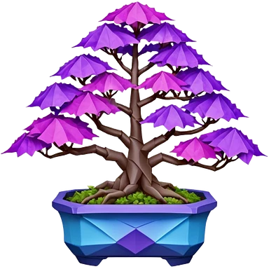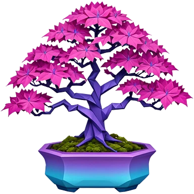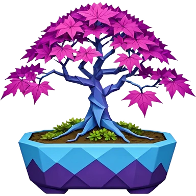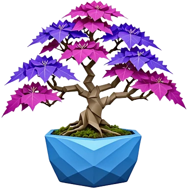 Futuristic alien maples Bonsai hair-fine-leaf group crimson crystal azalea purple and cream blue forest planting in origami style pot emoji