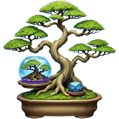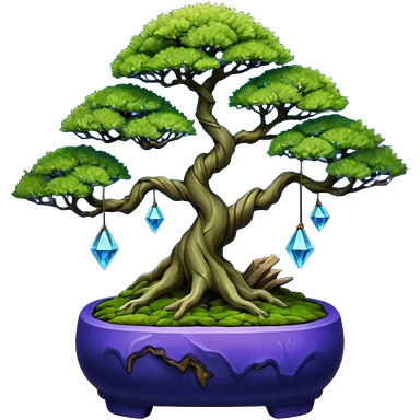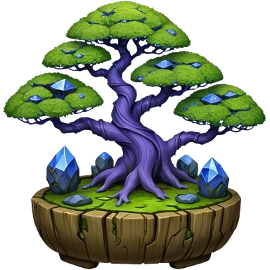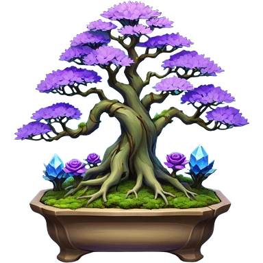 Futuristic wild glowing space alien moss maples Bonsai hair-fine-leaf group multi faceted intricate crystal inspired boxwood purple rose blue informal rocky cliffhanger eight trees forest planting in shallow origami slab style pot with big animal-like feet emoji
