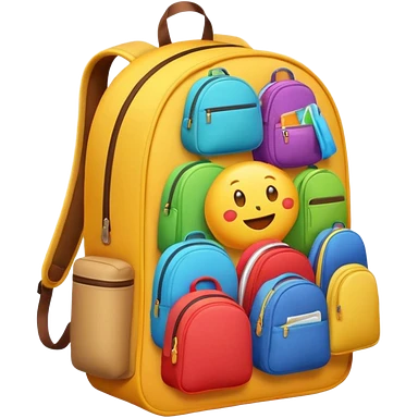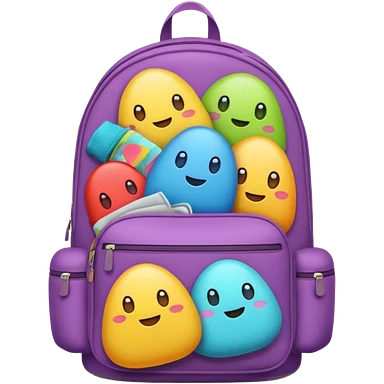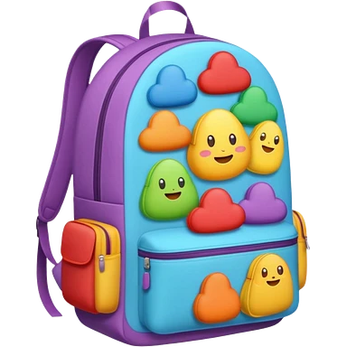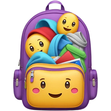 Emoji-style backpack overflowing with clothes, rounded cute shapes, soft shadows, colorful emoji