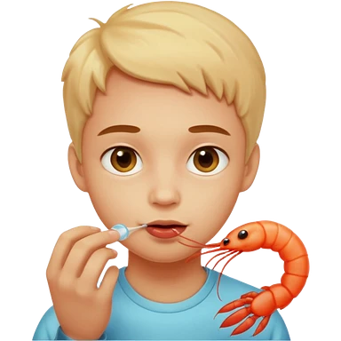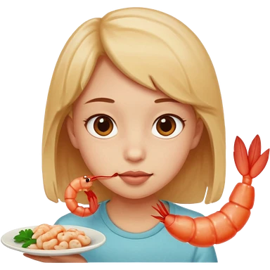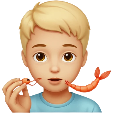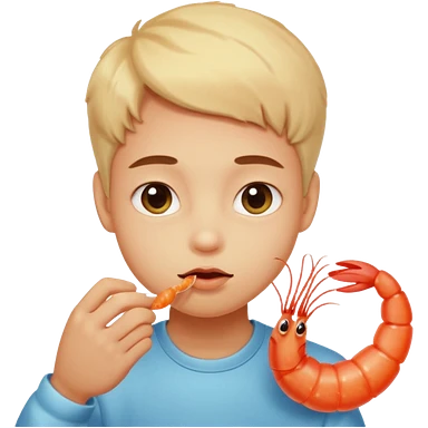 Emoji-style person tasting a weird-looking shrimp, curious expression, cute rounded face, soft shading emoji