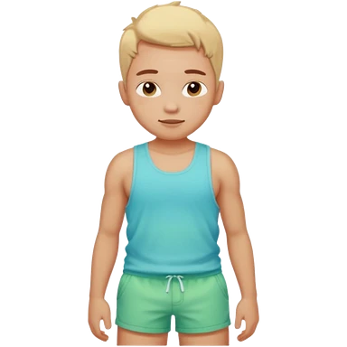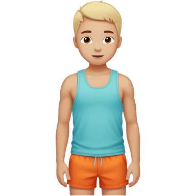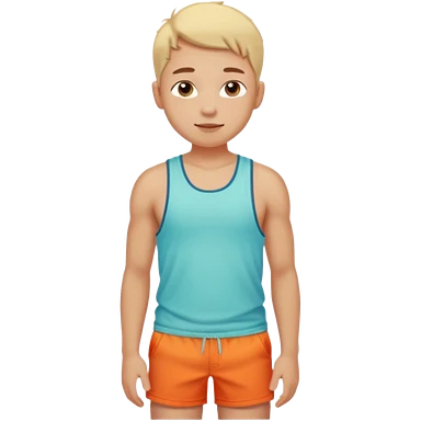 Emoji-style person in beach shorts with sunburned shoulders and chest, tank top outline, cute rounded features, soft shading, vibrant colors emoji