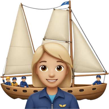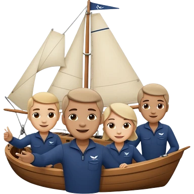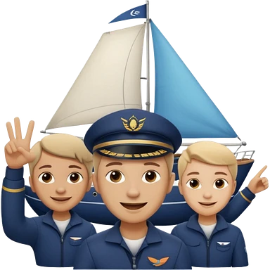 Emoji-style person taking a selfie with small sailing crew behind, rounded faces, soft shading, smiling, PNG cutout emoji