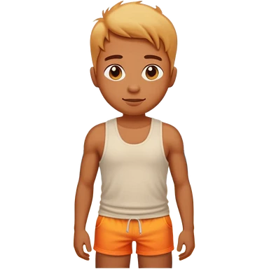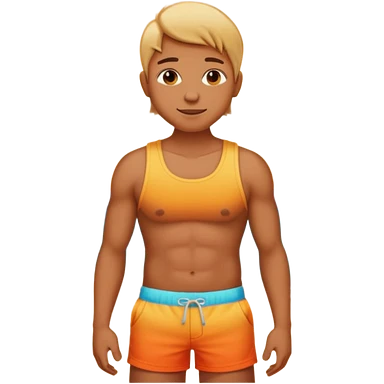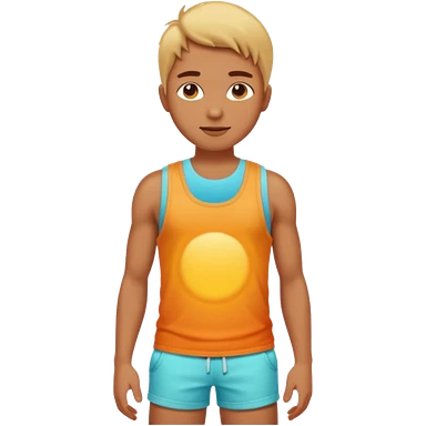 Emoji-style person in beach shorts with sunburned shoulders and chest, tank top outline, cute rounded features, soft shading, vibrant colors emoji
