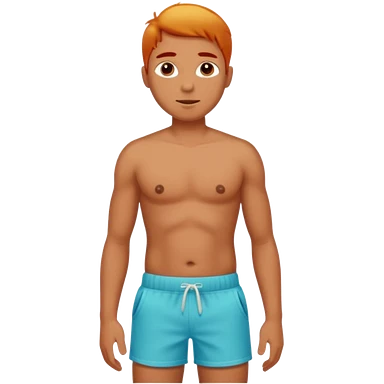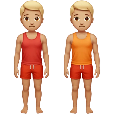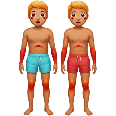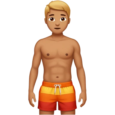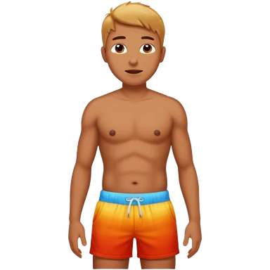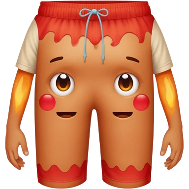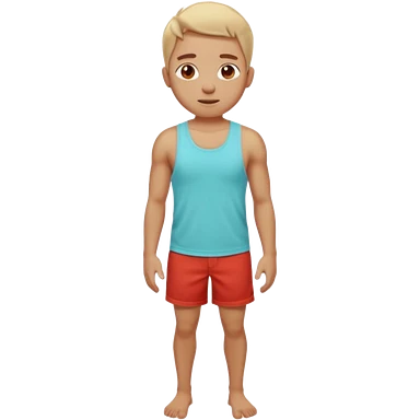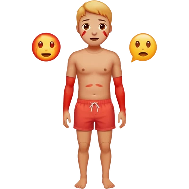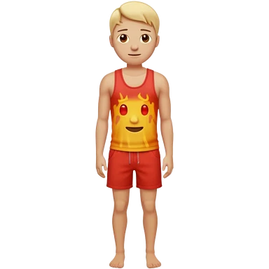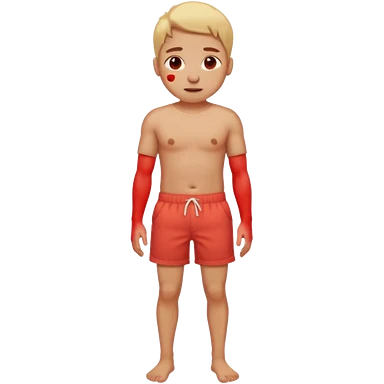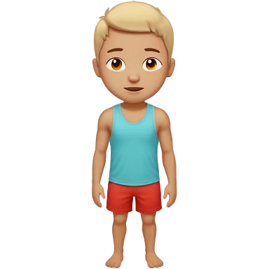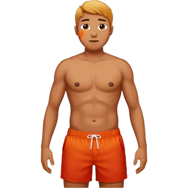 Emoji-style person standing in beach shorts, skin visibly sunburned and red on arms, legs, and face, but chest and shoulders clearly lighter with tank top tan lines. Expression shows mild pain or discomfort, cute rounded emoji design, soft 3D shading, vibrant colorsemoji