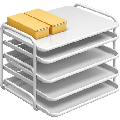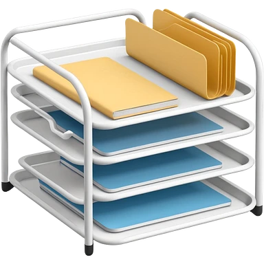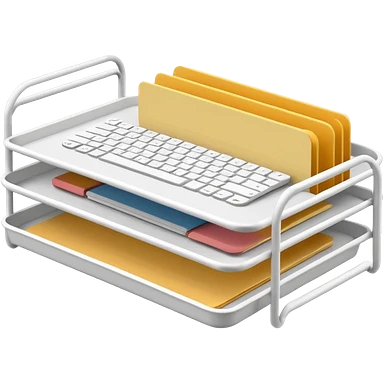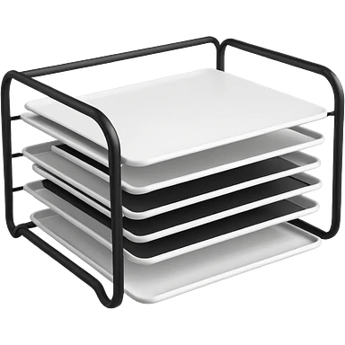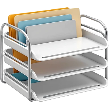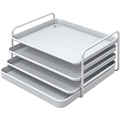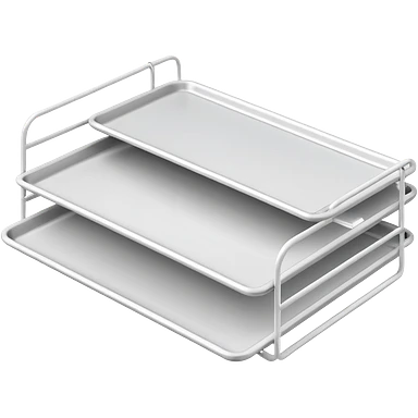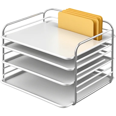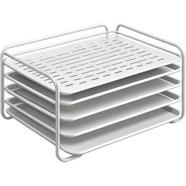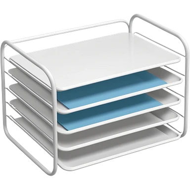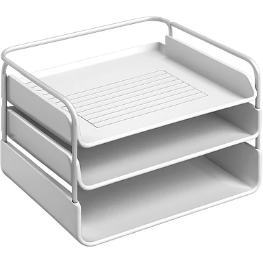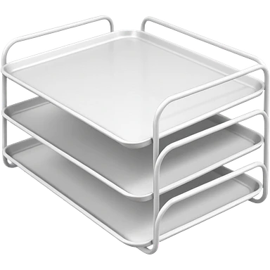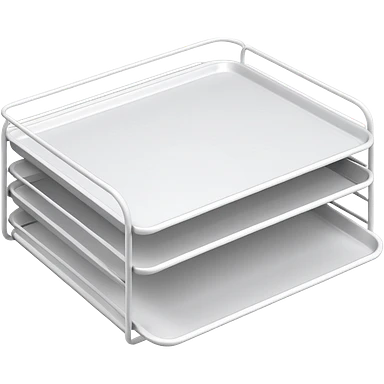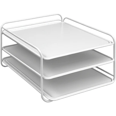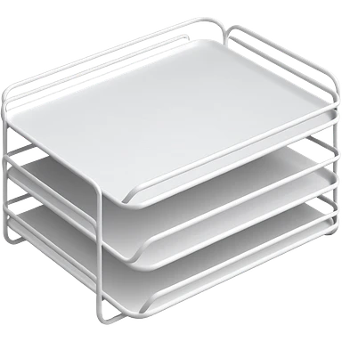 A minimal, clean emoji-style illustration of a white metal desk paper organizer tray, shown in slight isometric view so its structure is readable at a small scale. The organizer is rectangular with rounded corners, made of thin white metal wires, forming two to three stacked horizontal slots. emoji
