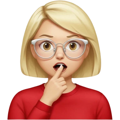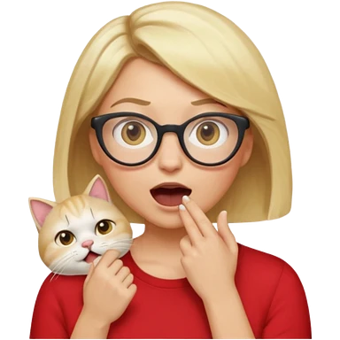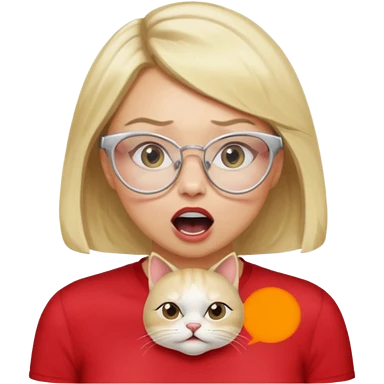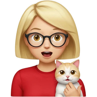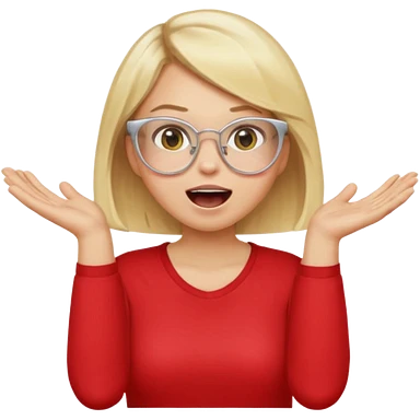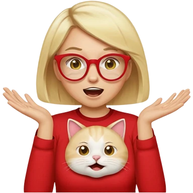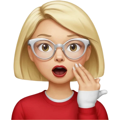 emoji style, waist-up woman with light skin, blonde bob hair, white cat-eye glasses, red shirt, both hands cupped around her mouth, shouting with joy on simple light background emoji | AI Emoji Generator