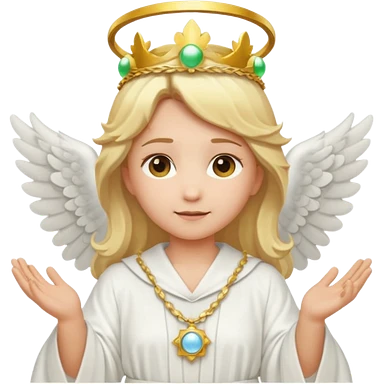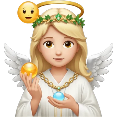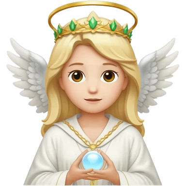 Emoji-style angel: blonde hair, laurel crown, halo, white wings, white robe, glowing orb, soft cute emoji look. emoji