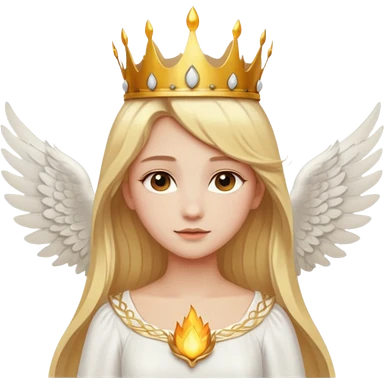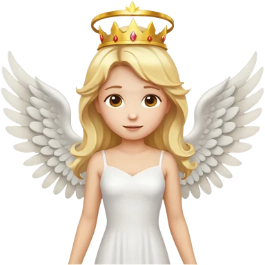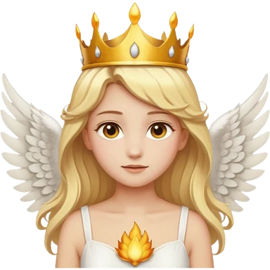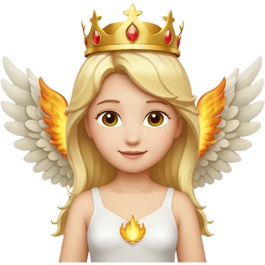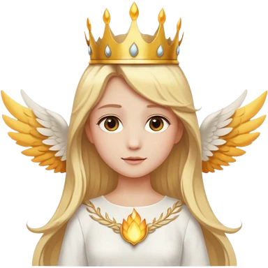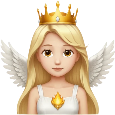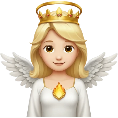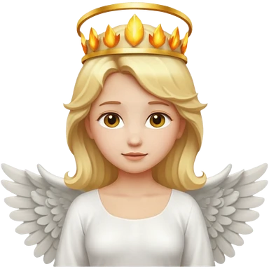 Emoji-style angel: blonde hair, golden flame-like crown, golden halo, large detailed white wings, white dress, soft cute emoji aesthetic. emoji