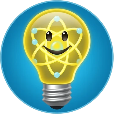neon yellow lightbulb emoji with smiling face, rotating atom inside, chemical bubbles, electric blue... emoji