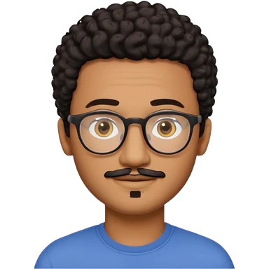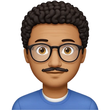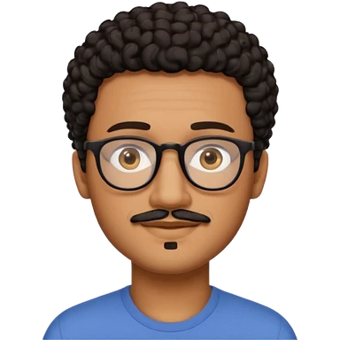 A friendly person with medium-brown skin, large warm brown eyes, thin rectangular glasses, a short mustache and small goatee, black short curly hair. Rounded face, calm slight smile. Head-and-shoulders emoji style, bold outlines, simple shapes, bright colors, transparent background. emoji
