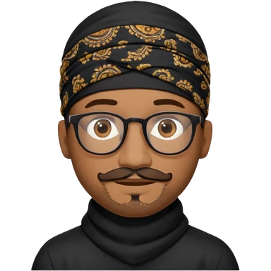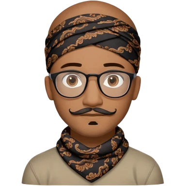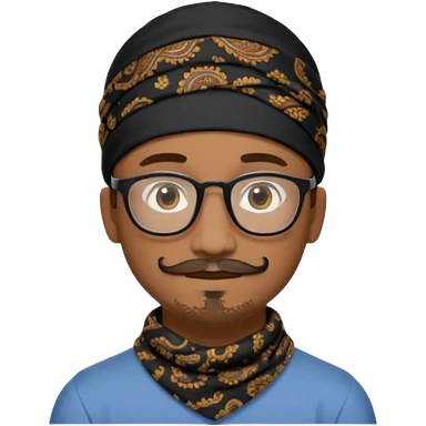 A friendly person with medium-brown skin, large warm brown eyes, thin rectangular glasses, a short mustache and small goatee, wearing a black paisley bandana. Rounded face, calm slight smile. Head-and-shoulders emoji style, bold outlines, simple shapes, bright colors, transparent background. emoji