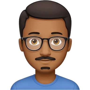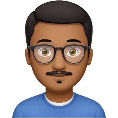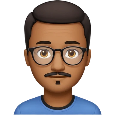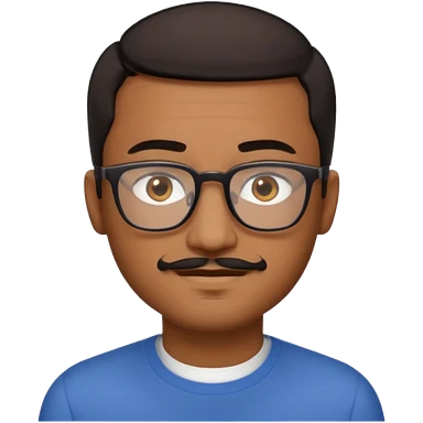 A friendly person with medium-brown skin, large warm brown eyes, thin rectangular glasses, a short mustache and small goatee, black short hair. Rounded face, calm slight smile. Head-and-shoulders emoji style, bold outlines, simple shapes, bright colors, transparent background. emoji