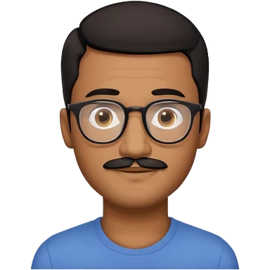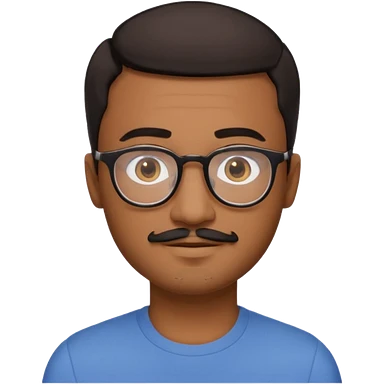 A friendly person with medium-brown skin, large warm brown eyes, thin rectangular glasses, a short mustache and small goatee, black hair. Rounded face, calm slight smile. Head-and-shoulders emoji style, bold outlines, simple shapes, bright colors, transparent background. emoji