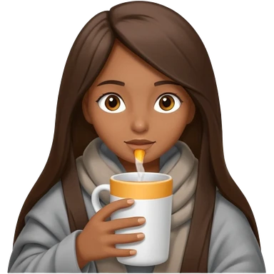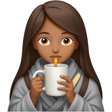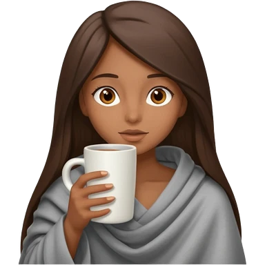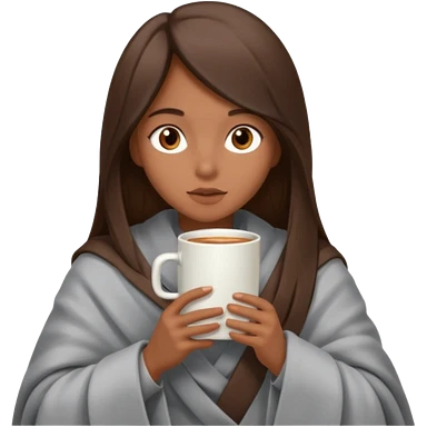 A girl with brown eyes, an ios emoji, long straight hair, wrapped in a gray blanket, and drinking from a New Year's mug emoji