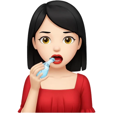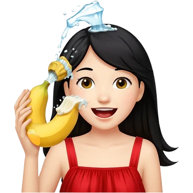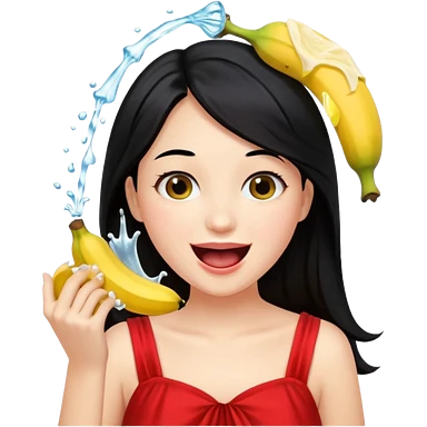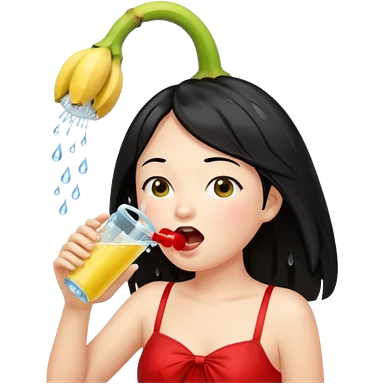 a girl with black hair and red dress rinsing mouth with pale yellow water coming out from a banana from her above emoji
