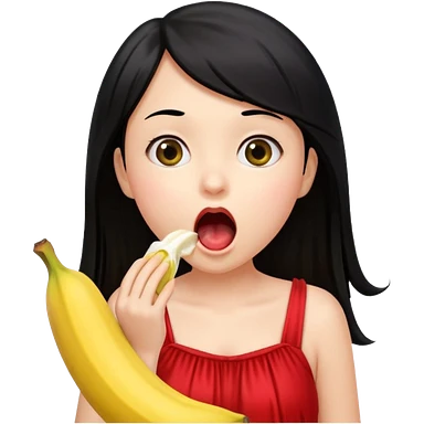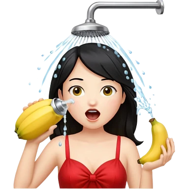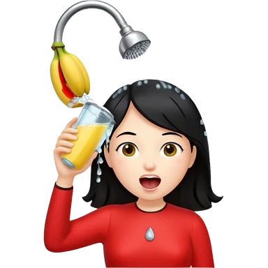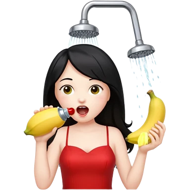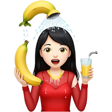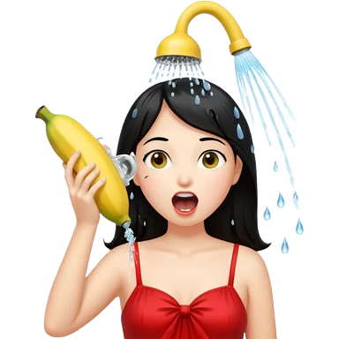 a girl with black hair and red dress with opened mouth drinking pale yellow water coming out from a shower looking like a banana above her head emoji
