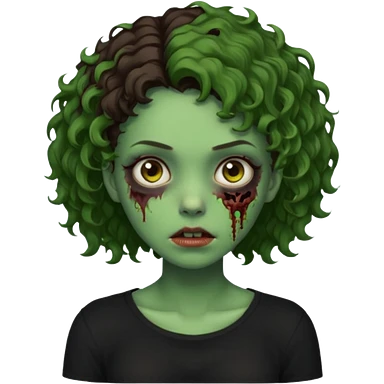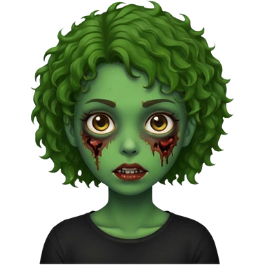 Zombie girl emoji verde com cabelo curto cacheado castanho com uma blusa preta emoji