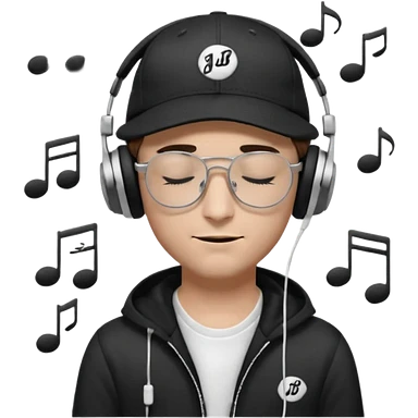“Emoji of a white man with dark brown hair under a black baseball cap, wearing a black t‑shirt and 1980s‑style black Ray‑Ban rectangle sunglasses, with black musical notes floating around his head, emoji