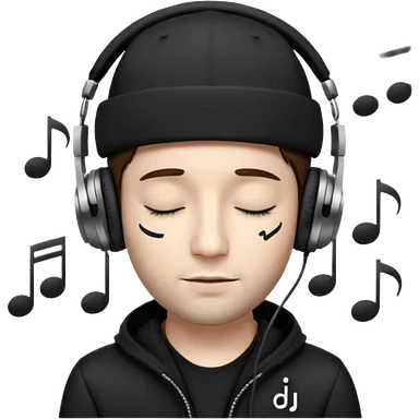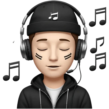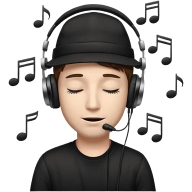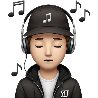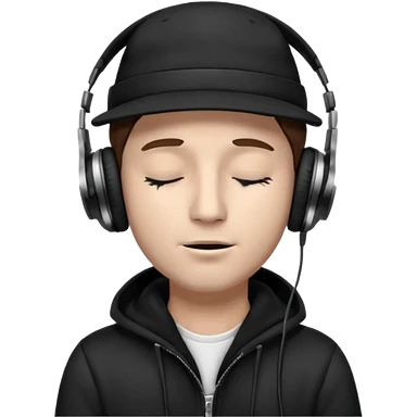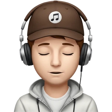 emojis.com dj-man-white-with-baseball-cap---rayban-sun-glasses-80s---brown-hair---closed-eyes-with-headphones-on-with-musical-note-over-head-(listening-to-music-)---eyes-closed-no-glasses---black-hat--musical-notes EYS c losed grey sweatshirt emoji | AI Emoji Generator