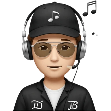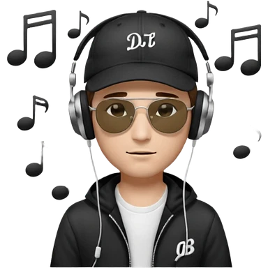 Emoji of a white man with short dark brown hair under a black baseball cap, wearing a black t‑shirt and 1980s‑style black Ray‑Ban rectangle sunglasses black lenses, with black musical notes floating around his head, word "DJ DLG" written on the hat emoji