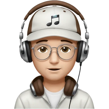 dj man white with baseball cap - rayban glasses - brown hair - closed eyes with headphones on with musical note over head (listening to music ) emoji