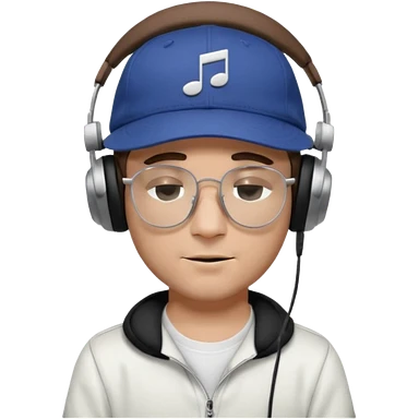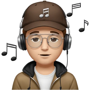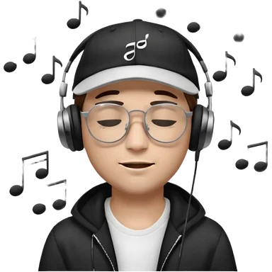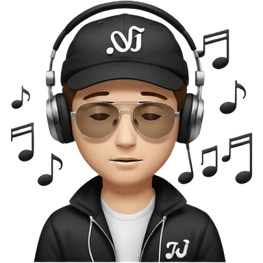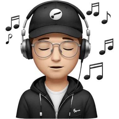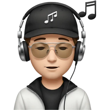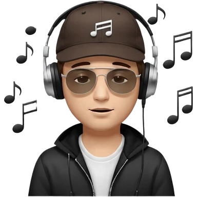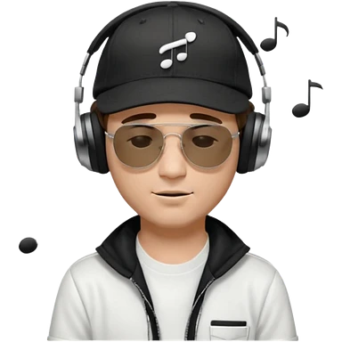 “Emoji of a white man with light brown hair under a black baseball cap, wearing a black t‑shirt and 1980s‑style black Ray‑Ban rectangle sunglasses, with black musical notes floating around his head, modern iOS emoji style. emoji
