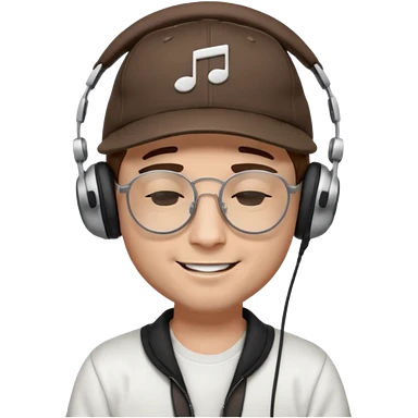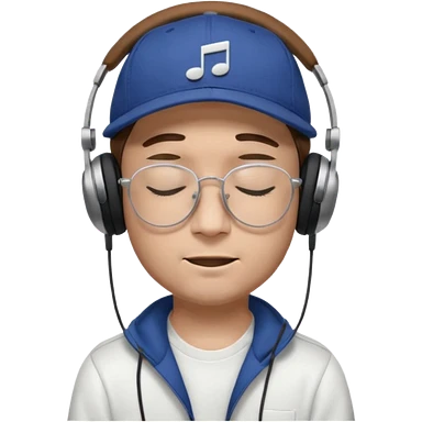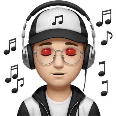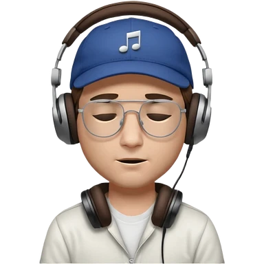 dj man white with baseball cap - rayban glasses - brown hair - closed eyes with headphones on with musical note over head (listening to music ) - eyes closed no glasses - black hat musical notes floating around head emoji