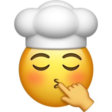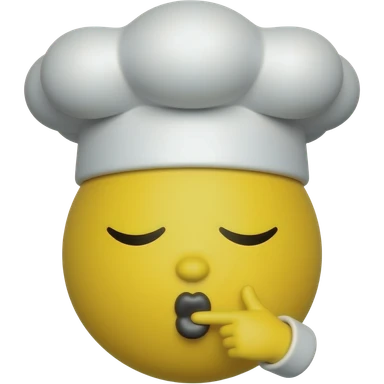 Emojis.com minimalista de beijo do chef (cabeça de chef única com o clássico formato de emoji de cabeça redonda amarela pequena, usando um chapéu de chef, com os dois olhos fechados e uma mão pequena (sem braço) perto da boca, beijando a própria mão e mandando um beijo). emoji