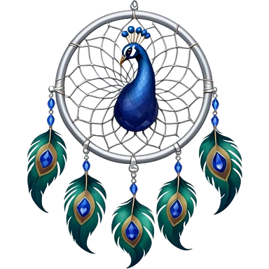 a Silver Dreamcatcher with sapphire-stones and emerald-stones, and with peacock-feathers. Big sapphire gem in the middle. Many tiny emeral gems around it. emoji