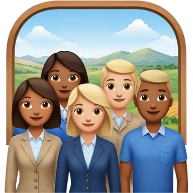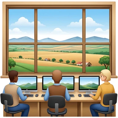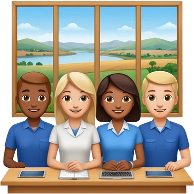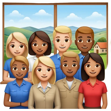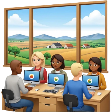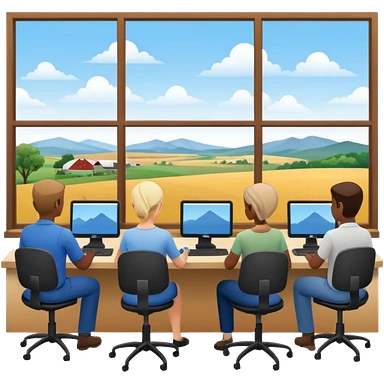 Employees of a startup company working on their computers while looking out the window at the rural landscape. emoji