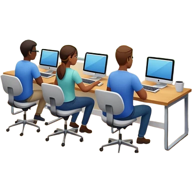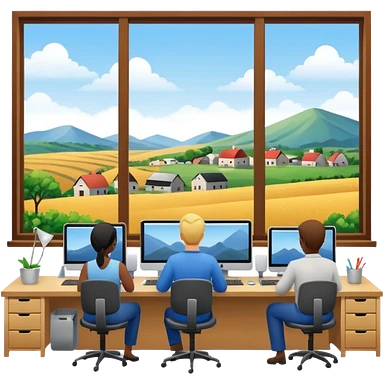 Employees of a startup company working on their computers while looking out the window at the rural landscape.w emoji