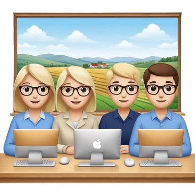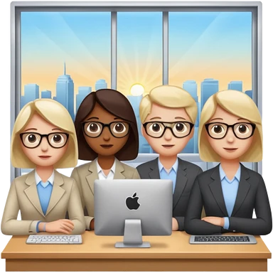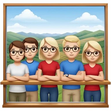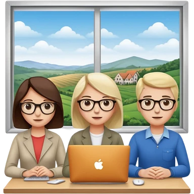 Employees of a startup company working on their computers while looking out the window at the rural landscape. emoji | AI Emoji Generator