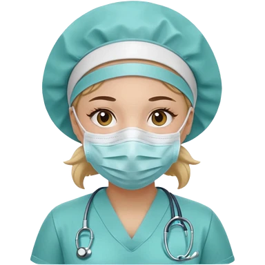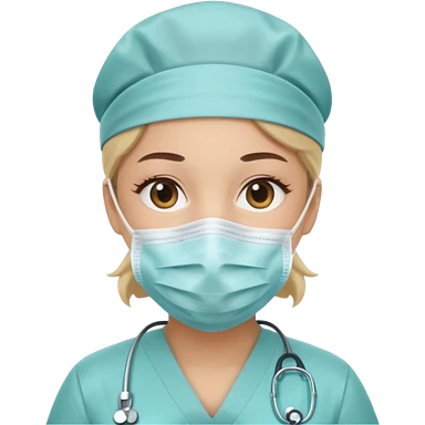 Enfermera vestida de verde, rubia pelo rizado, ojos azules con gafas emoji