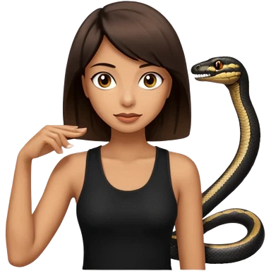 Femme brune yeux marron avec une coupe carré noir qui descend sur l'épaule , femme couleur de peau typé, avec un cobra a côté , débardeur noir emoji