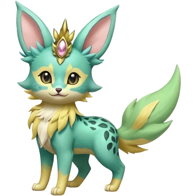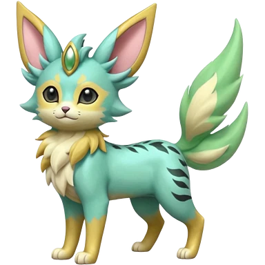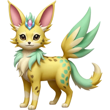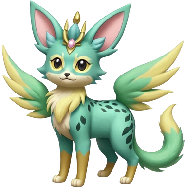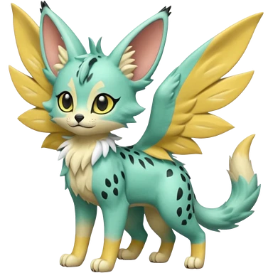Epic complex detailed pastel minty green, pastel beige yellow pastel realistic aesthetic-scenic-Fakémon-Zorua-Litten-Leafeon-Sylveon-Trico-Sergal-Serval-Vernid-creature (full body) with far wings, shiny sparkly fairycore theme emoji