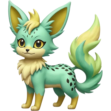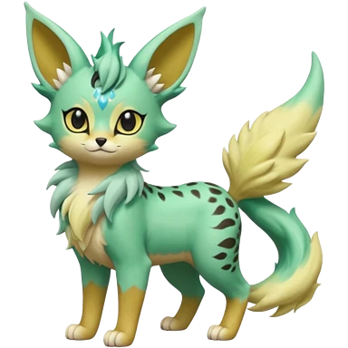 Epic complex detailed pastel minty green, pastel beige yellow pastel realistic aesthetic-scenic-Fakémon-Zorua-Litten-Leafeon-Trico-Sergal-Serval-Vernid-creature (full body) with far wings, shiny sparkly fairycore theme emoji