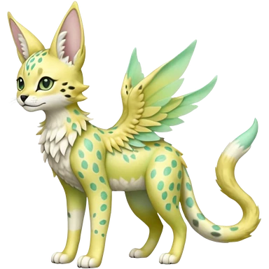 Epic complex detailed pastel minty green, pastel beige yellow pastel realistic aesthetic-scenic-Fakémon-Zorua-Litten-Trico-Sergal-Serval-Vernid-creature (full body) with far wings, shiny sparkly fairycore theme emoji