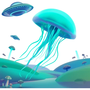 extraterrestrial futuristic otherworldly cyan bioluminescent neon-glowing aesthetic scenery jellyfish flying saucers UFOs mushroom emoji