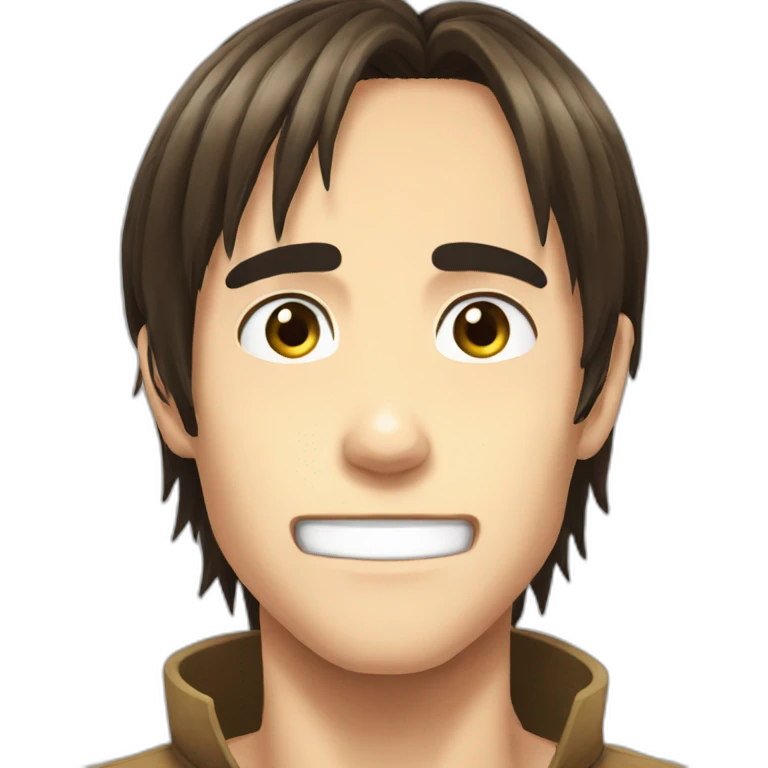 “Create an avatar that looks like Eren Yeager from Attack on Titan, Season 3 — sharp jawline, tied-back long brown hair, intense green eyes, serious expression.” emoji