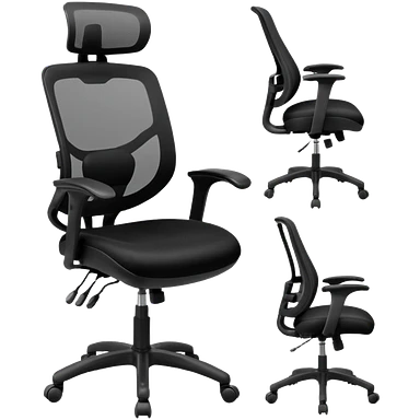 An ergonomic office setup with a height-adjustable desk and a large flat monitor on top. Next to it, a modern ergonomic swivel chair with supportive backrest, and a small potted plant placed on the desk or floor to add a healthy touch emoji