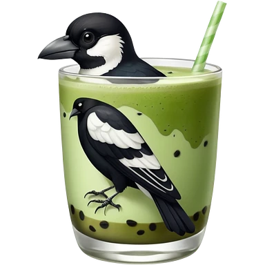 It’s an Australien Magpie sitting on an iced matcha latte on the edge of the glass. It has green matcha on its beak indicating it drank. The iced matxha latte is in a see through glass and white from the oat milk on the bottom and green on top…and there is a straw in the drink and ice cubes emoji