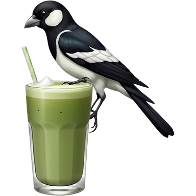 It’s an Australien Magpie (just black and white feathers) sitting on an iced matcha latte on the edge of the glass. It has green matcha on its beak indicating it drank. The iced matxha latte is in a see through glass and white from the oat milk on the bottom and green on top… one straw and ice cubes emoji